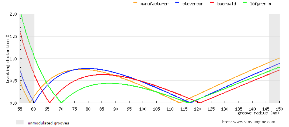 The centrifugal forceThis is caused by the needle being set over the center of the record (the so-called "overhang"). This causes the needle to be "drawn in" by the rotational movement of the record.Friction of the needle in the grooveFriction of the needle with the groove wall creates a tangential force. The magnitude of this force depends on the tracking force and the coefficient of friction.The groove radius of the recordThe Friction also depends on the radius of the slab. It has a minimum at about 3.5 ”and is higher on the inner and outer grooves. This will result in a higher skating force on both the inner and outer grooves.Needle shapeResearch has shown that an elliptical needle shape creates more skating force than a spherical needle shape.![]() Tracking errorSince with a turntable arm the stylus makes a circular movement across the record, there is always an error angle that the stylus makes with the groove. This is because the die of the record is cut with a tangential arm and thus without an error angle. Partly for this reason, tangential tonearms have been developed that are precisely intended to be able to play without this error angle.But a tangential arm is difficult to make and causes other problems that are not easy to solve. Especially the resonance problem of these tonearms is a difficult factor to control. Tracking forceThe set tracking force has an effect on the skating force. The higher the tracking force, the more skating force is generated. The Wally Skater that I discuss further on uses this to set the correct anti skate value.The modulation in the grooveThe amount of information in the groove partly determines the skating force. In other words, with high modulation and thus a lot of music information such as large orchestras, big bands, heavy rock, etc., relatively much skating power is generated. Quiet pieces of music, small ensembles or a light guitar piece, on the other hand, generate much less skating power. Dirt and nicotine attack or dust also provides "information" and therefore has a direct effect on the skating force.![]() Compliance of the cartridgeThe energy absorbed by the movement of the needle and cantilever suspension influences the skating force. The higher the compliance and thus the lower the suspension stiffness, the lower the skating force.It is greatest at low frequencies where the lateral force on the stylus are greatest and increases towards the center of the record. This force can vary with different elements and even between elements of the same type and brand. It is best to use a high-compliance stylus with a low-mass arm, and a low-compliance stylus with a high-mass arm. If you try to use a low-compliance stylus with a low-mass arm, the cantilever's suspension won't fully absorb the low-frequency (bass) vibrations from the groove and will partially transmit these vibrations to the arm (causing the arm to move), resulting in a bass-light sound. |